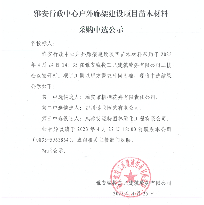 雅安行政中心戶(hù)外廊架建設(shè)項(xiàng)目苗木材料采購(gòu)中選公示