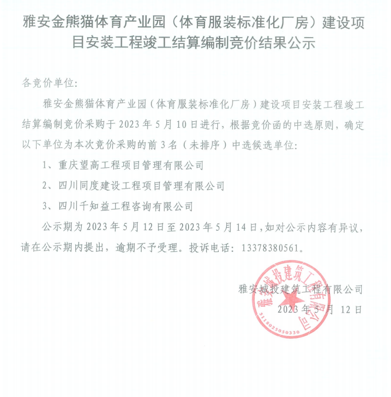 雅安金熊貓體育產(chǎn)業(yè)園(體育服裝標準化廠房)建設(shè)項目安裝工程結(jié)算編制競價結(jié)果公示