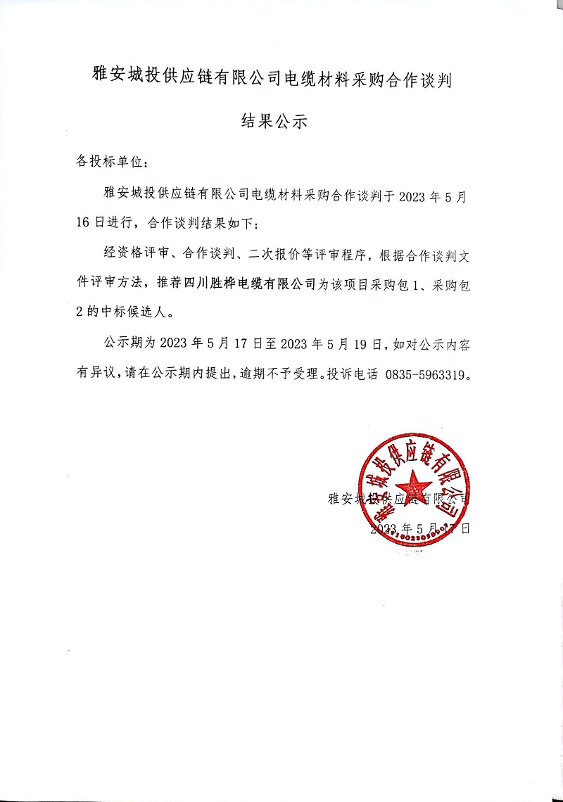 雅安城投供應(yīng)鏈有限公司電纜材料采購合作談判結(jié)果公示