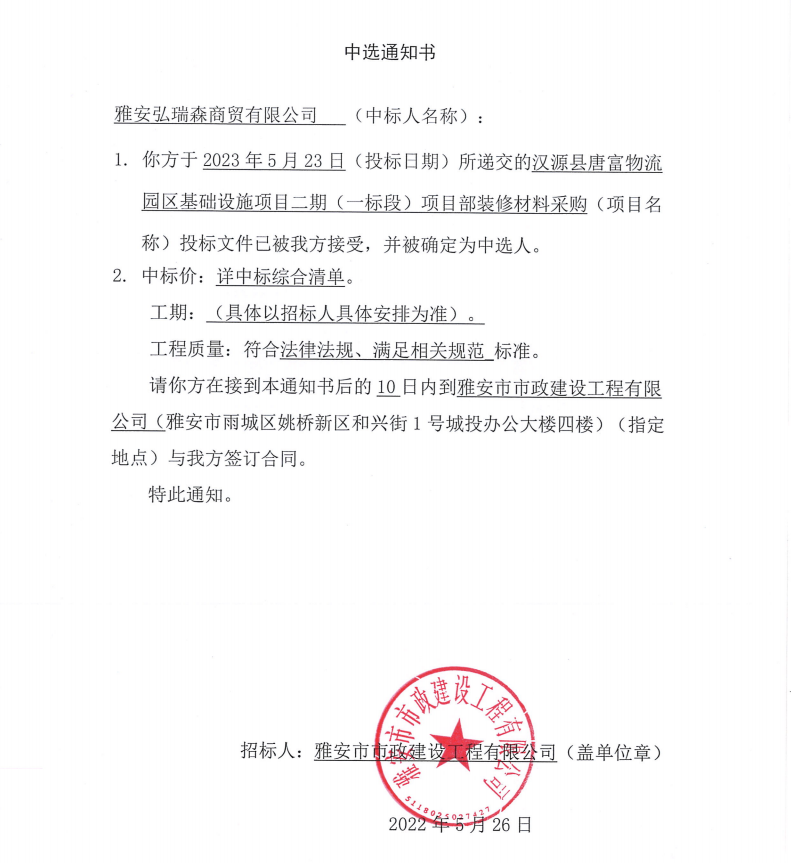漢源縣唐富物流園區(qū)基礎(chǔ)設(shè)施項目二期(一標(biāo)段)項目部裝修材料采購中選通知書