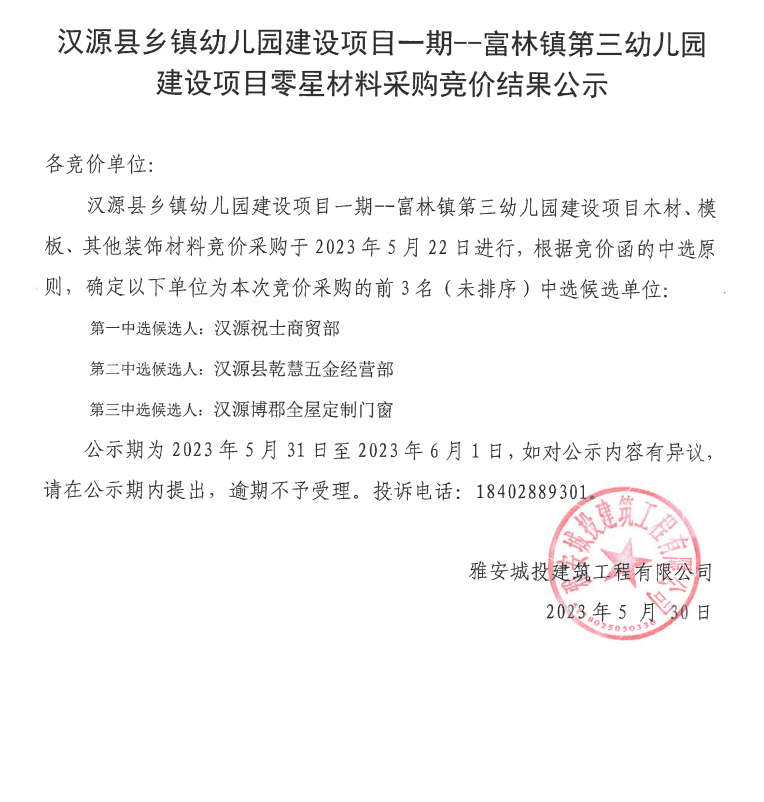 漢源縣鄉(xiāng)鎮(zhèn)幼兒園建設(shè)項目一期--富林鎮(zhèn)第三幼兒園建設(shè)項目零星材料采購競價結(jié)果公示