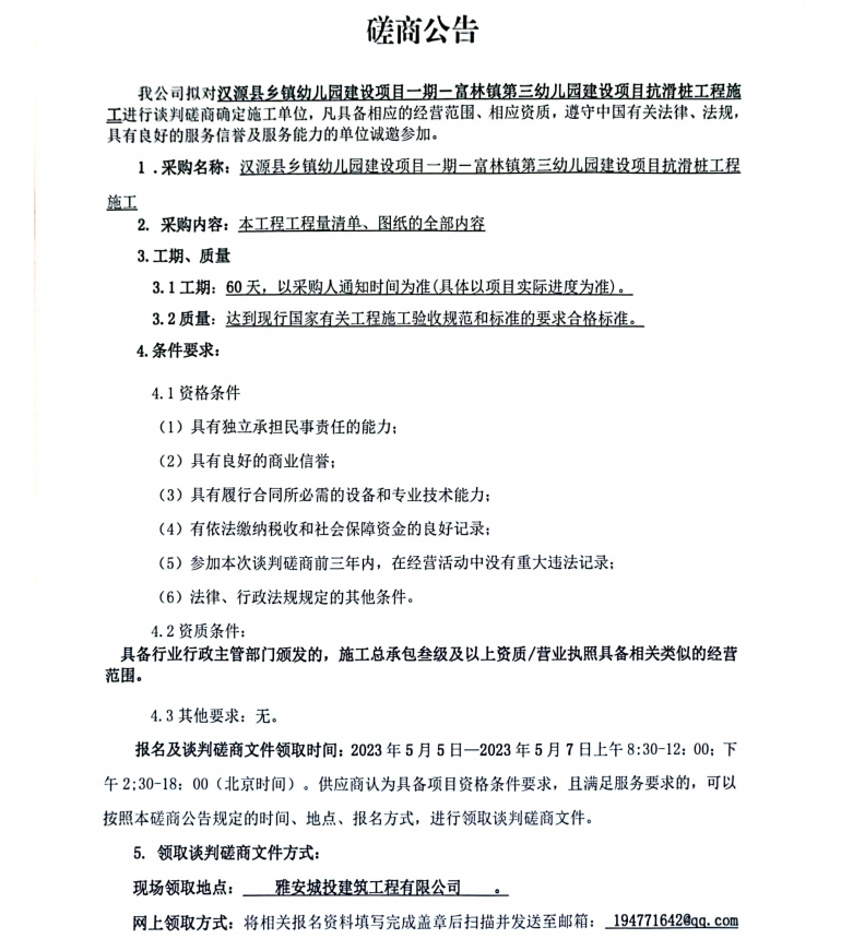 漢源縣鄉(xiāng)鎮(zhèn)幼兒園建設(shè)項(xiàng)目一期一富林鎮(zhèn)第三幼兒園建設(shè)項(xiàng)目抗滑樁工程施工談判磋商公告