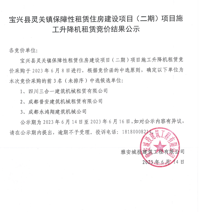 寶興縣靈關(guān)鎮(zhèn)保障性租賃住房建設(shè)項目(二期)項目施工升降機(jī)租賃競價結(jié)果公示