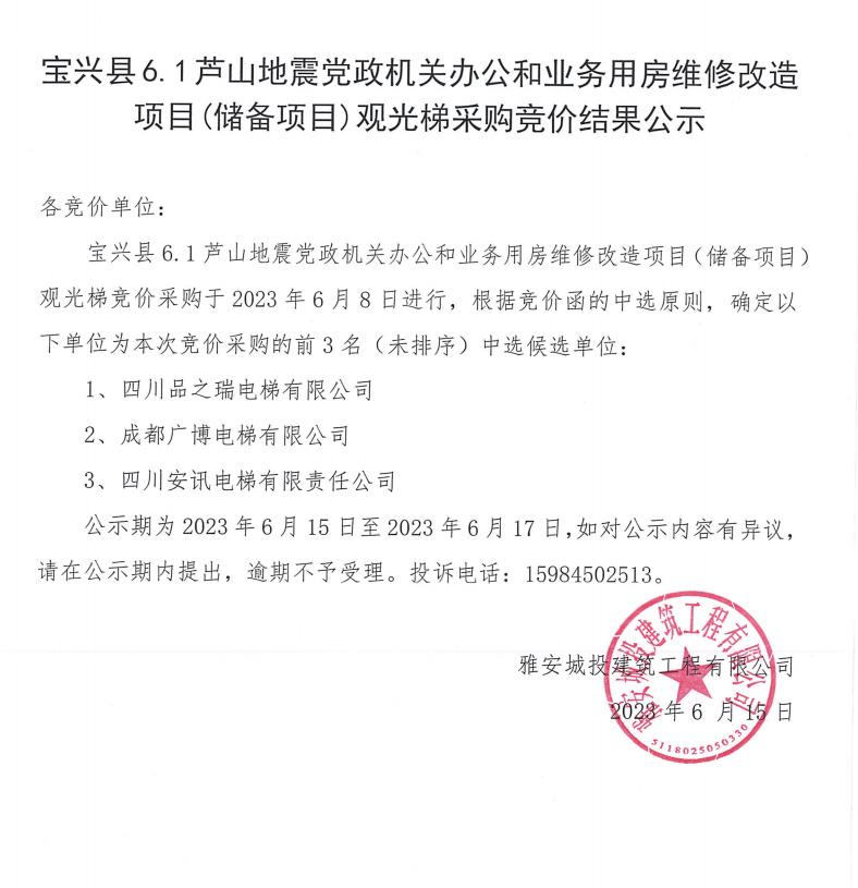 寶興縣6.1蘆山地震黨政機關(guān)辦公和業(yè)務(wù)用房維修改造項目(儲備項目)觀光梯采購競價結(jié)果公示