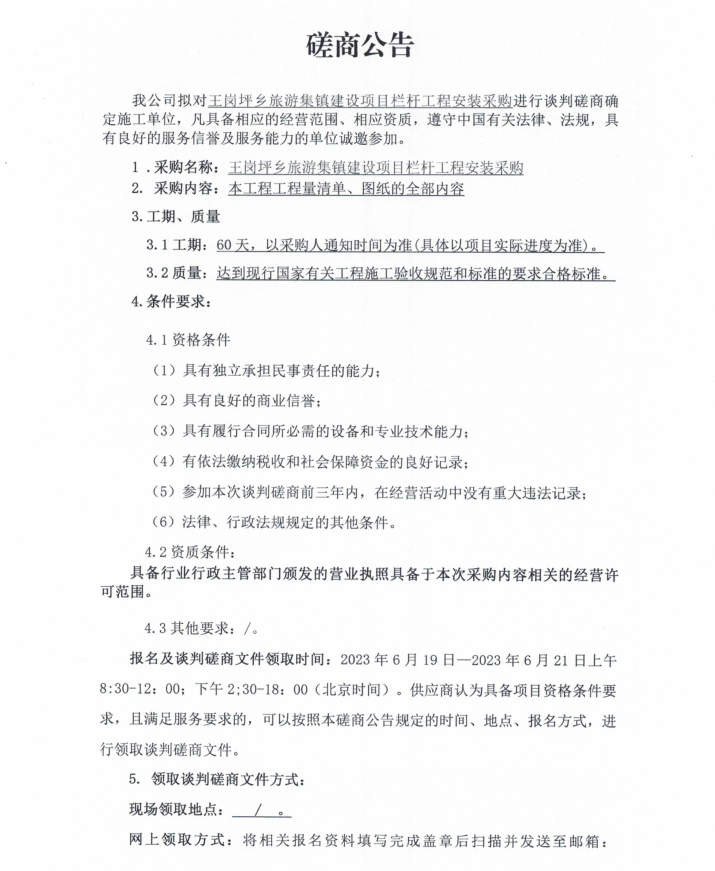 王崗坪鄉(xiāng)旅游集鎮(zhèn)建設(shè)項目欄桿工程安裝采購談判磋商公告