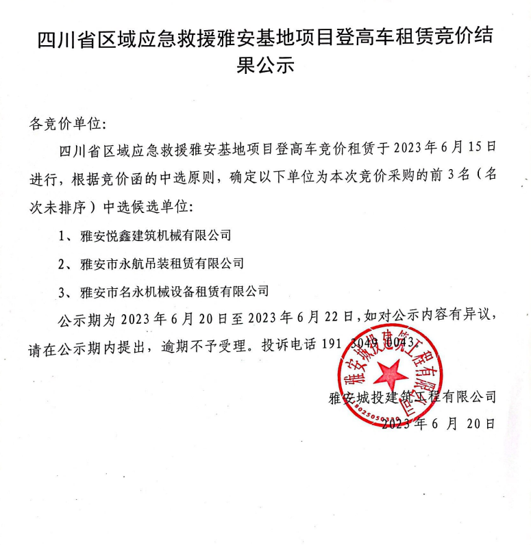 四川省區(qū)域應(yīng)急救援雅安基地項目登高車租賃競價結(jié)果公示
