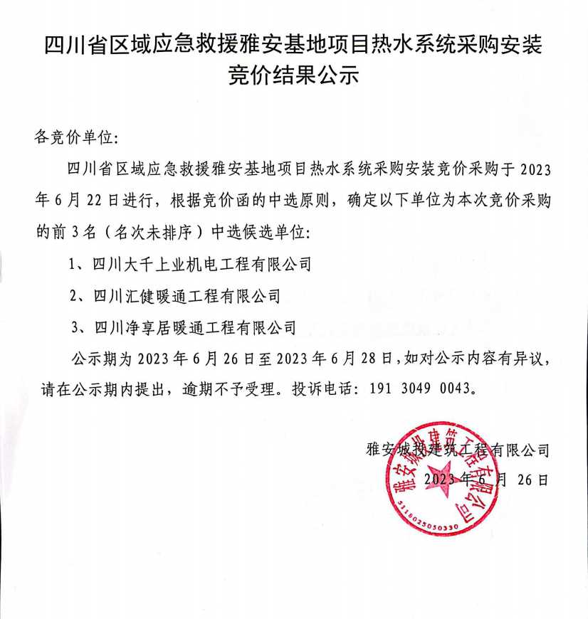 四川省區(qū)域應(yīng)急救援雅安基地項(xiàng)目熱水系統(tǒng)采購安裝競價(jià)結(jié)果公示