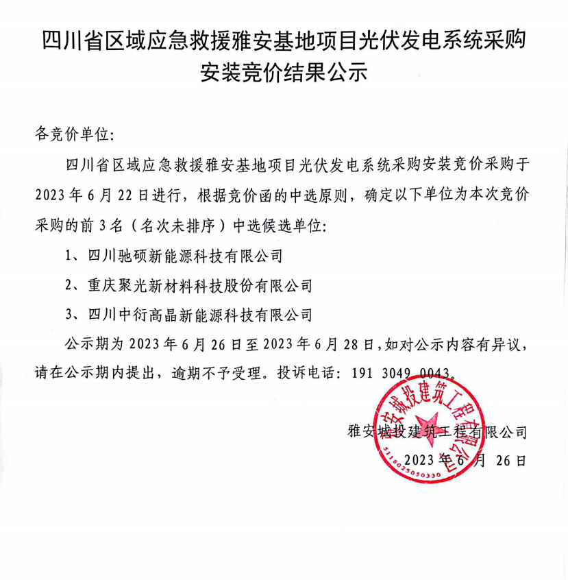 四川省區(qū)域應(yīng)急救援雅安基地項目光伏發(fā)電系統(tǒng)采購安裝競價結(jié)果公示