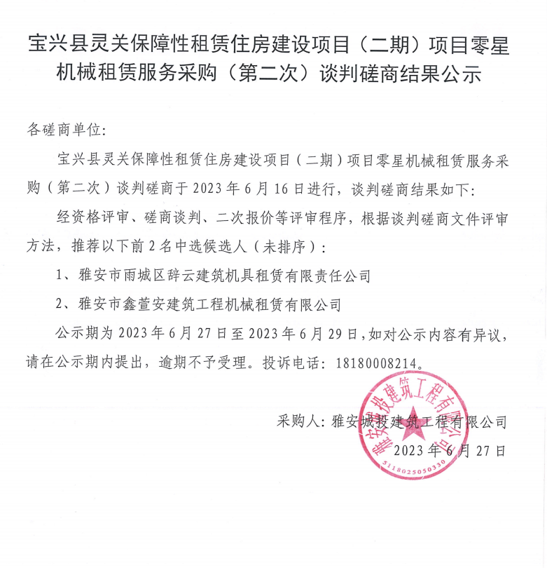 寶興縣靈關(guān)保障性租賃住房建設(shè)項目(二期)項目零星機(jī)械租賃服務(wù)采購(二次)談判磋商結(jié)果公示