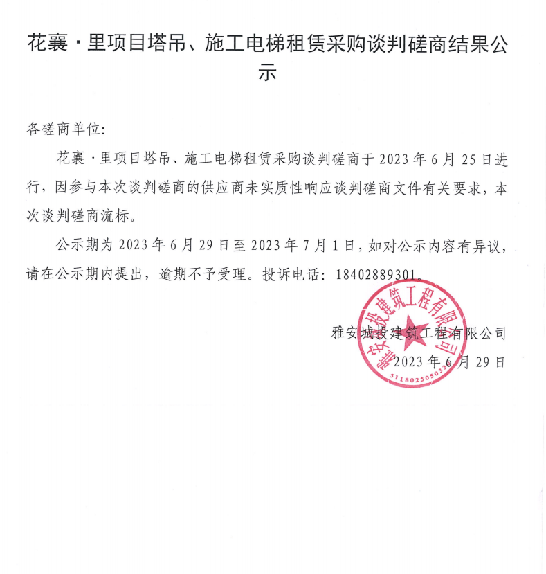 花襄·里項(xiàng)目塔吊、施工電梯租賃采購(gòu)談判磋商結(jié)果公示