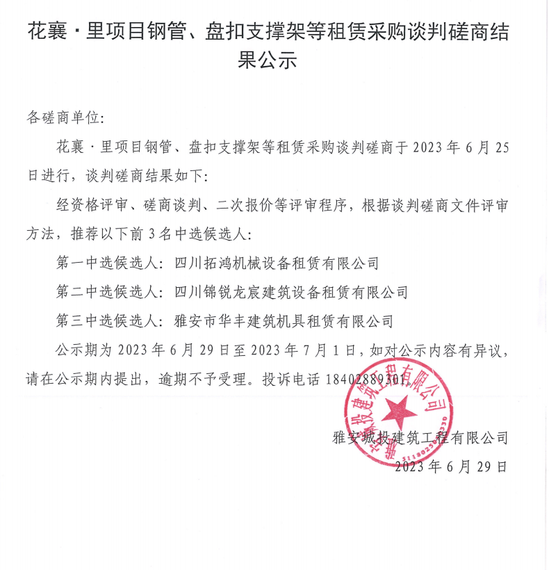 花襄·里項(xiàng)目鋼管、盤扣支撐架等租賃采購(gòu)談判磋商結(jié)果公示