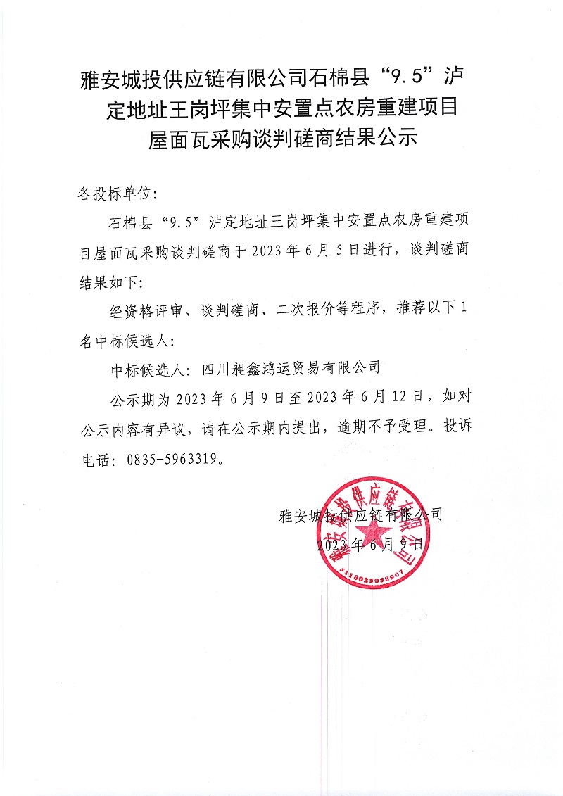 雅安城投供應(yīng)鏈有限公司石棉縣“9.5”瀘定地址王崗坪集中安置點(diǎn)農(nóng)房重建項(xiàng)目屋面瓦采購談判磋商結(jié)果公示