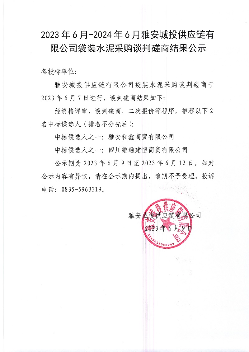 2023年6月-2024年6月雅安城投供應鏈有限公司袋裝水泥采購談判磋商結(jié)果公示