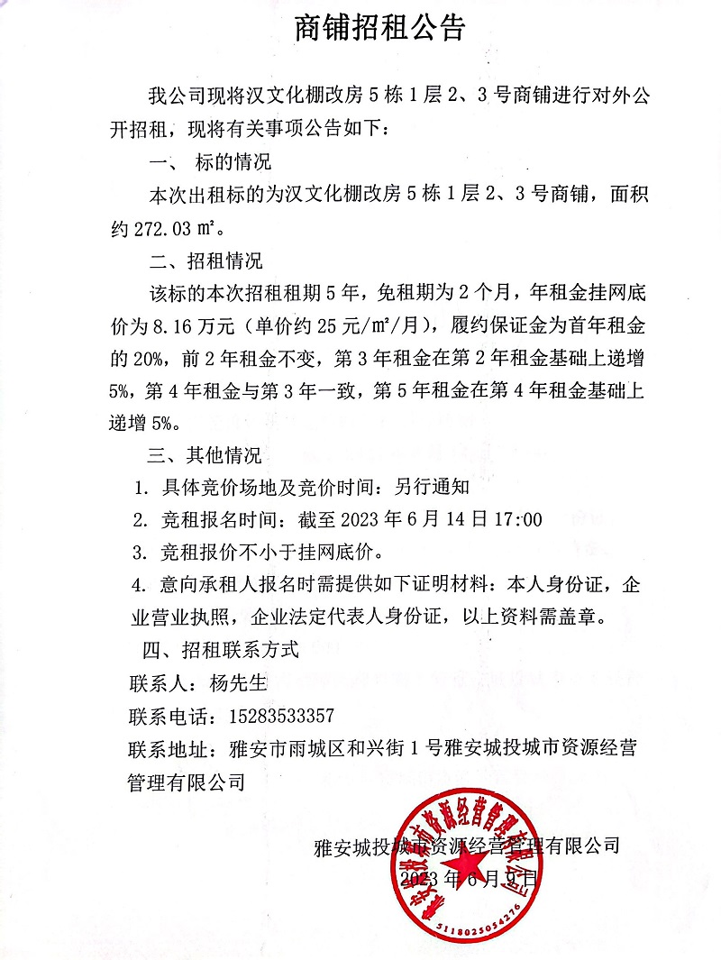 漢文化棚改房5棟1層2、3號(hào)商鋪招租公告