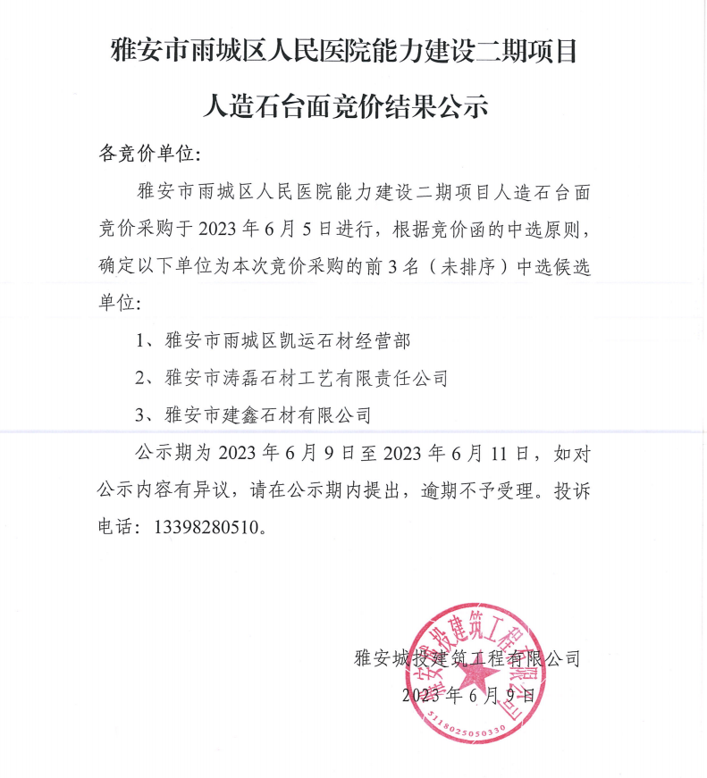 雅安市雨城區(qū)人民醫(yī)院能力建設二期項目人造石臺面競價結(jié)果公示