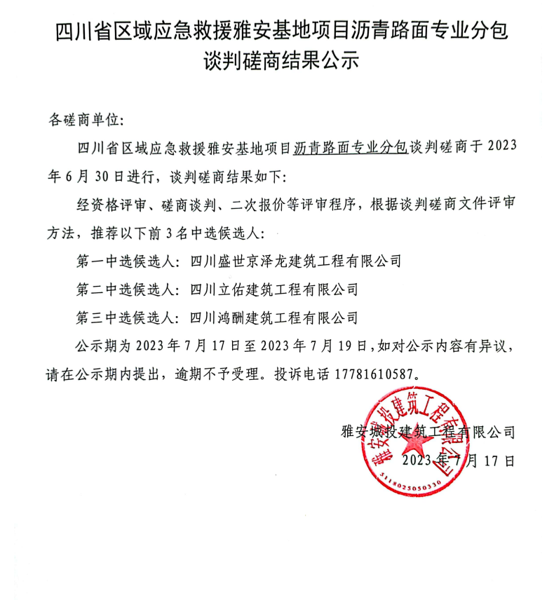 四川省區(qū)域應急救援雅安基地項目瀝青路面專業(yè)分包談判磋商結果公示