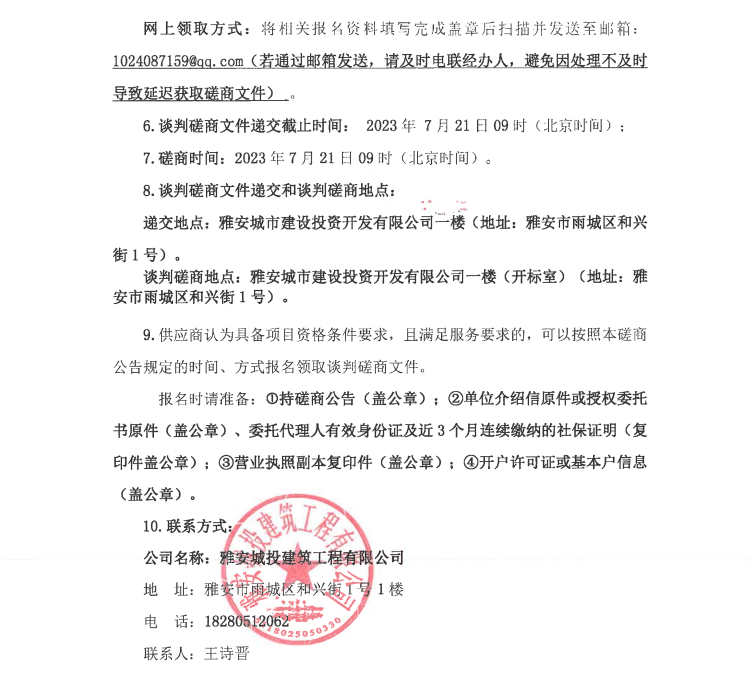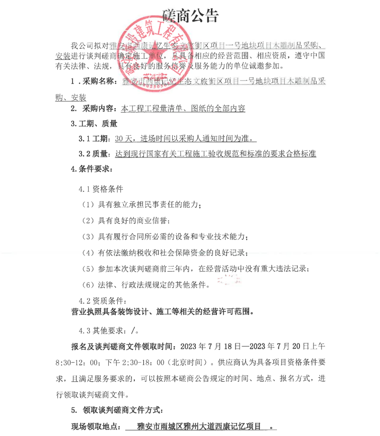 雅安市西康記憶生態(tài)文旅街區(qū)項(xiàng)目一號(hào)地塊項(xiàng)目木雕制品采購(gòu)、安裝談判磋商公告