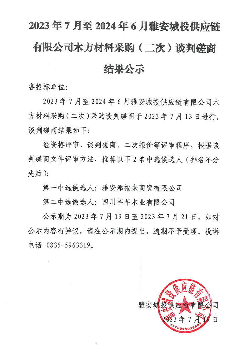 2023年7月至2024年6月雅安城投供應鏈有限公司木方材料采購(二次)談判磋商結(jié)果公示