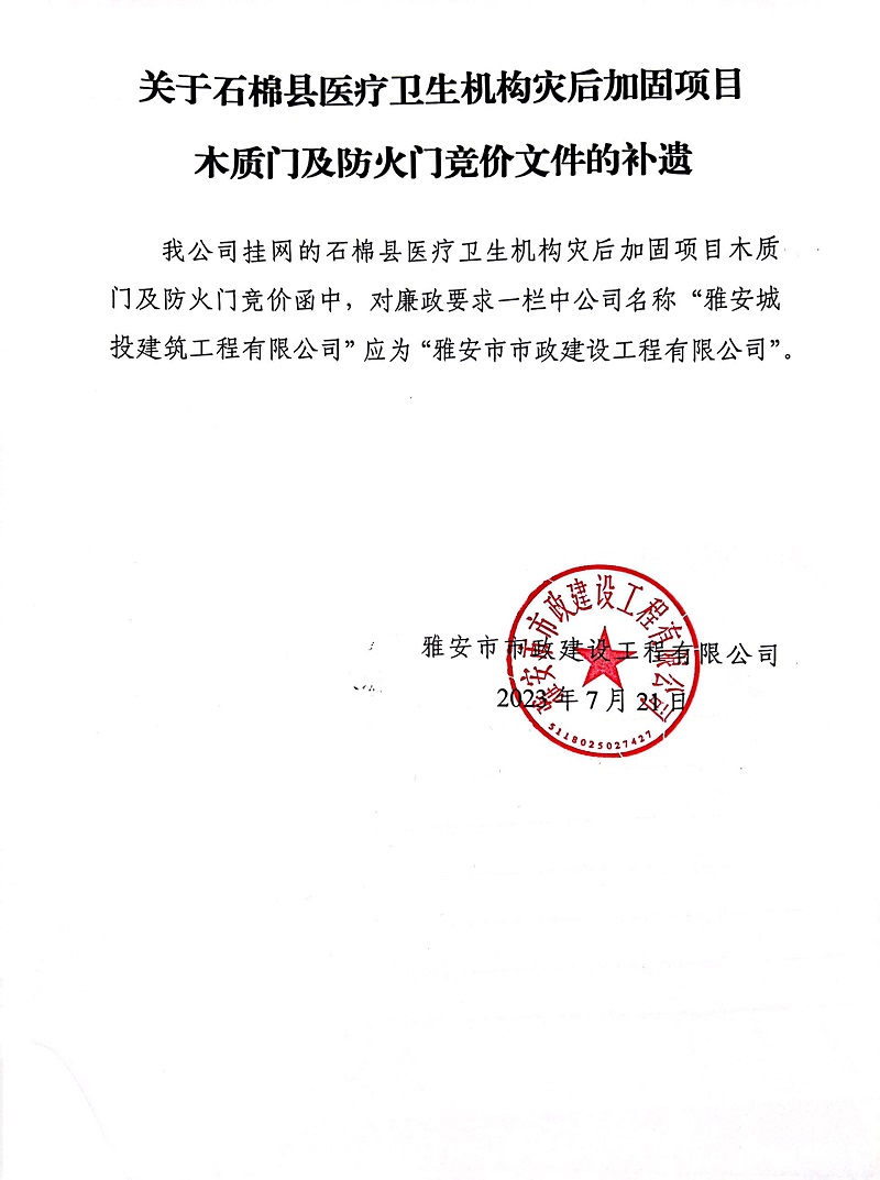 關于石棉縣醫(yī)療衛(wèi)生機構災后加固項目木質(zhì)門及防火門競價文件的補遺