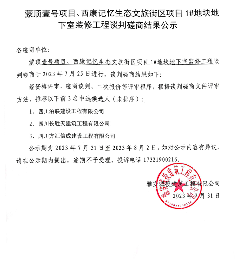 蒙頂壹號項(xiàng)目、西康記憶生態(tài)文旅街區(qū)項(xiàng)目1#地塊地下室裝修工程談判磋商結(jié)果公示