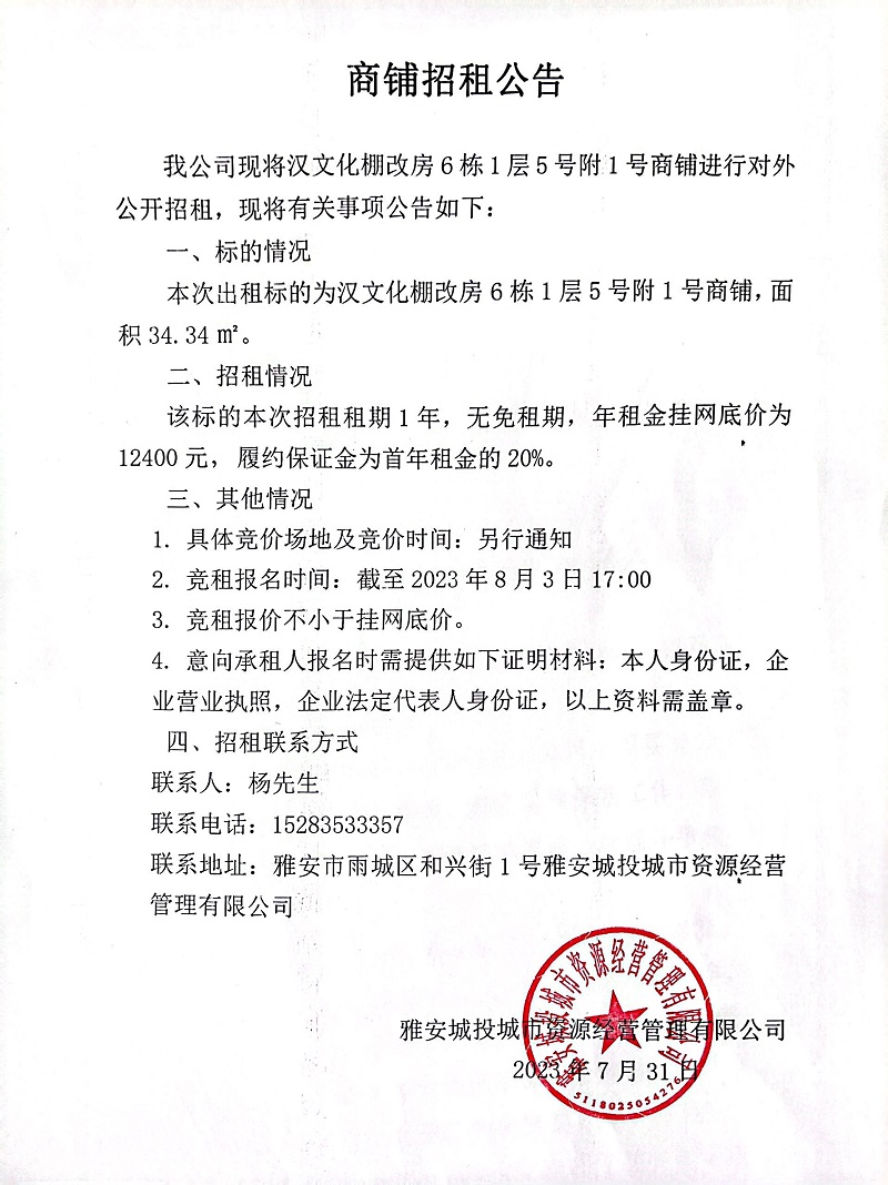 漢文化棚改房6棟1層5號(hào)附1號(hào)商鋪招租公告