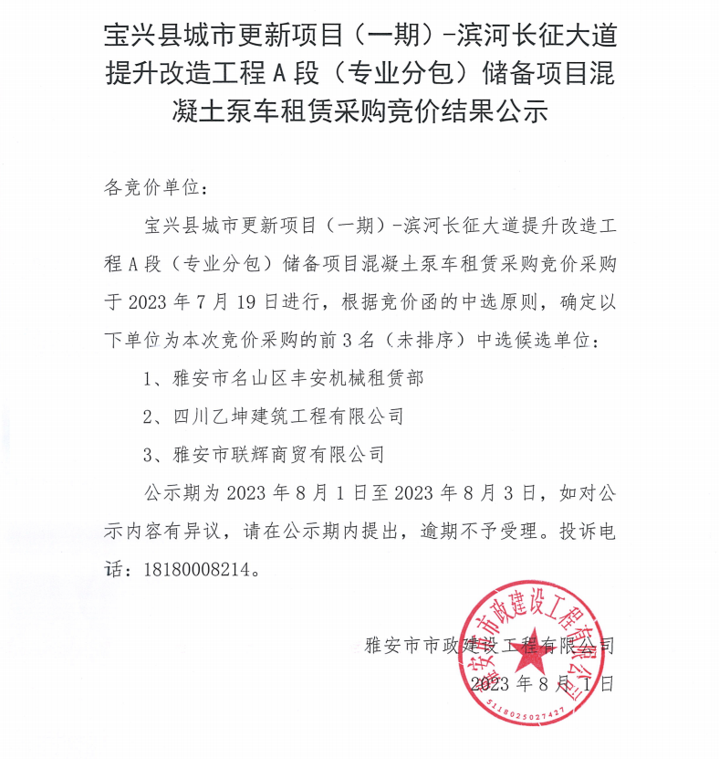 寶興縣城市更新項(xiàng)目(一期)-濱河長(zhǎng)征大道提升改造工程A段(專(zhuān)業(yè)分包)儲(chǔ)備項(xiàng)目混凝土泵車(chē)租賃采購(gòu)競(jìng)價(jià)結(jié)果公示