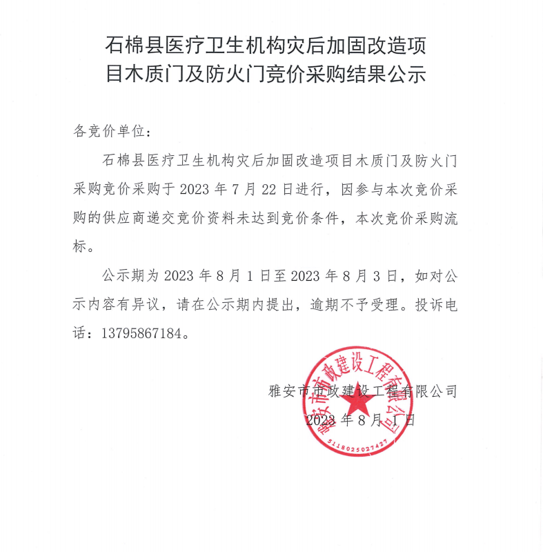 石棉縣醫(yī)療衛(wèi)生機(jī)構(gòu)災(zāi)后加固改造項(xiàng)目木質(zhì)門(mén)及防火門(mén)競(jìng)價(jià)采購(gòu)結(jié)果公示