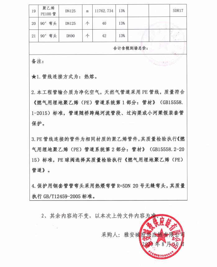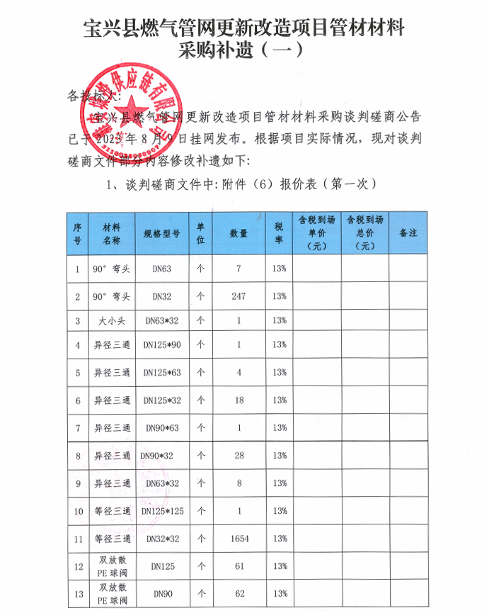 寶興縣燃?xì)夤芫W(wǎng)更新改造項(xiàng)目管材材料采購補(bǔ)遺(一)