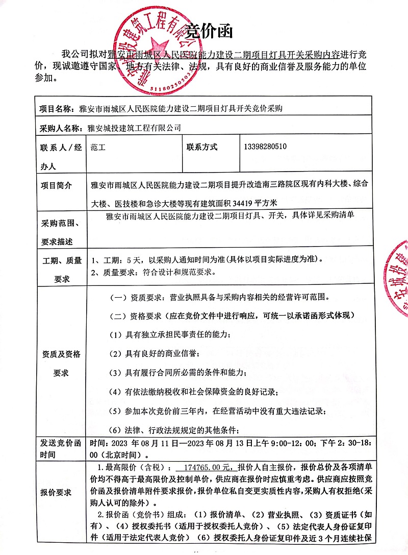 雅安市雨城區(qū)人民醫(yī)院能力建設(shè)二期項(xiàng)目燈具開關(guān)采購競(jìng)價(jià)公告