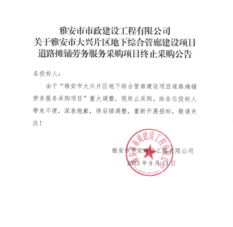雅安市市政建設(shè)工程有限公司關(guān)于雅安市大興片區(qū)地下綜合管廊建設(shè)項目道路攤鋪勞務(wù)服務(wù)采購項目終止采購公告