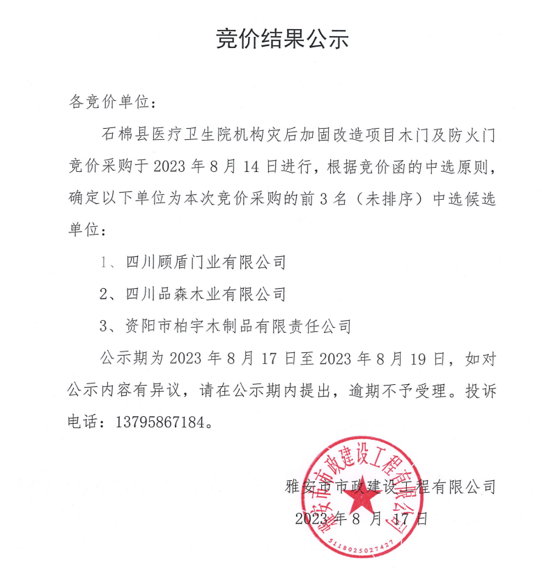 石棉縣醫(yī)療衛(wèi)生院機構(gòu)災后加固改造項目木門及防火門競價采購結(jié)果公示