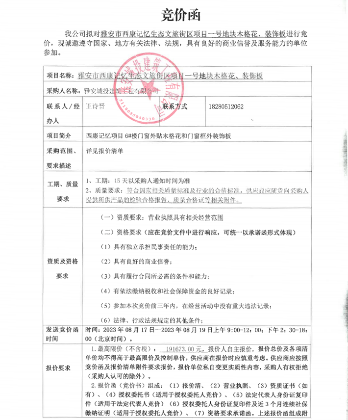 雅安市西康記憶生態(tài)文旅街區(qū)項(xiàng)目一號地塊木格花、裝飾板采購競價(jià)公告