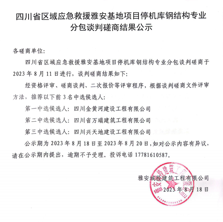 四川省區(qū)域應急救援雅安基地項目停機庫鋼結構專業(yè)分包談判磋商結果公示
