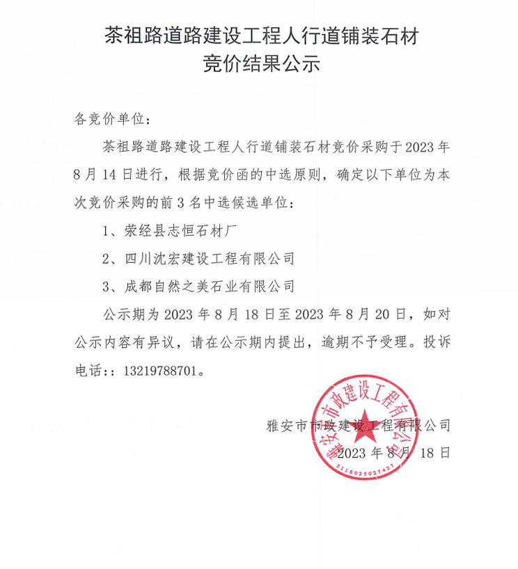 茶祖路道路建設(shè)工程人行道鋪裝石材競(jìng)價(jià)結(jié)果公示