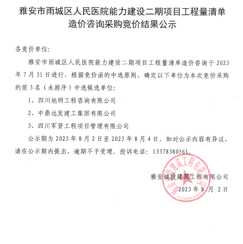 雅安市雨城區(qū)人民醫(yī)院能力建設(shè)二期項(xiàng)目工程量清單造價(jià)咨詢采購(gòu)競(jìng)價(jià)結(jié)果公示