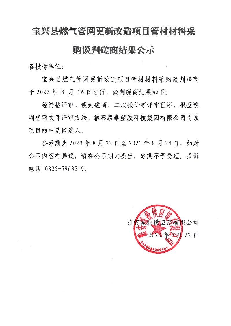 寶興縣燃?xì)夤芫W(wǎng)更新改造項(xiàng)目管材材料采購談判磋商結(jié)果公示