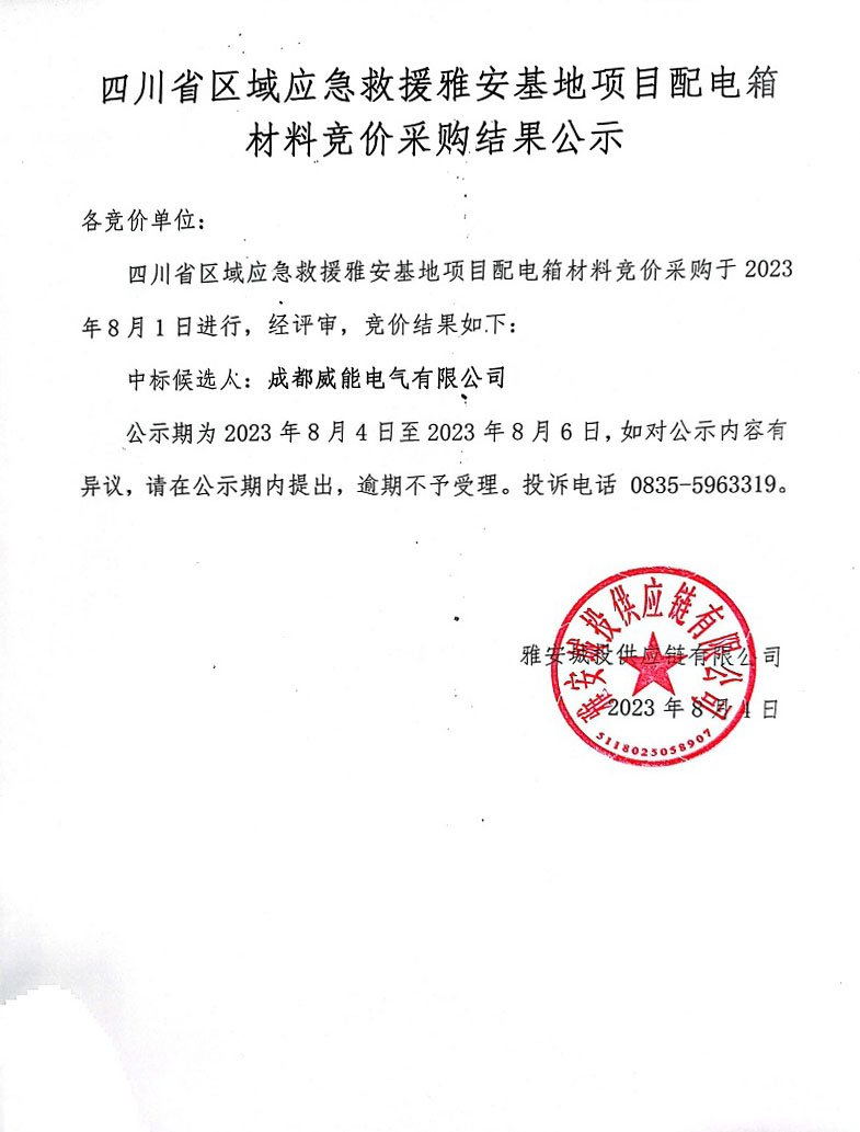 四川省區(qū)域應(yīng)急救援雅安基地項(xiàng)目配電箱材料競價(jià)采購結(jié)果公示