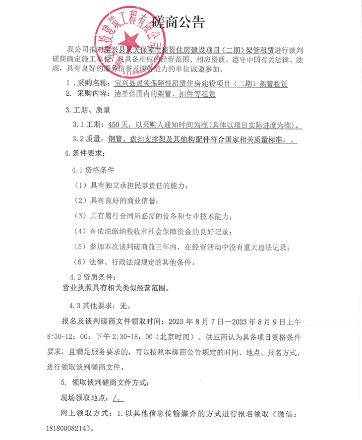 寶興縣靈關(guān)保障性租賃住房建設(shè)項目(二期)架管租賃談判磋商公告