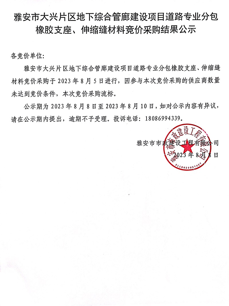 雅安市大興片區(qū)地下綜合管廊建設(shè)項(xiàng)目道路專業(yè)分包橡膠支座、伸縮縫材料競(jìng)價(jià)采購結(jié)果公示