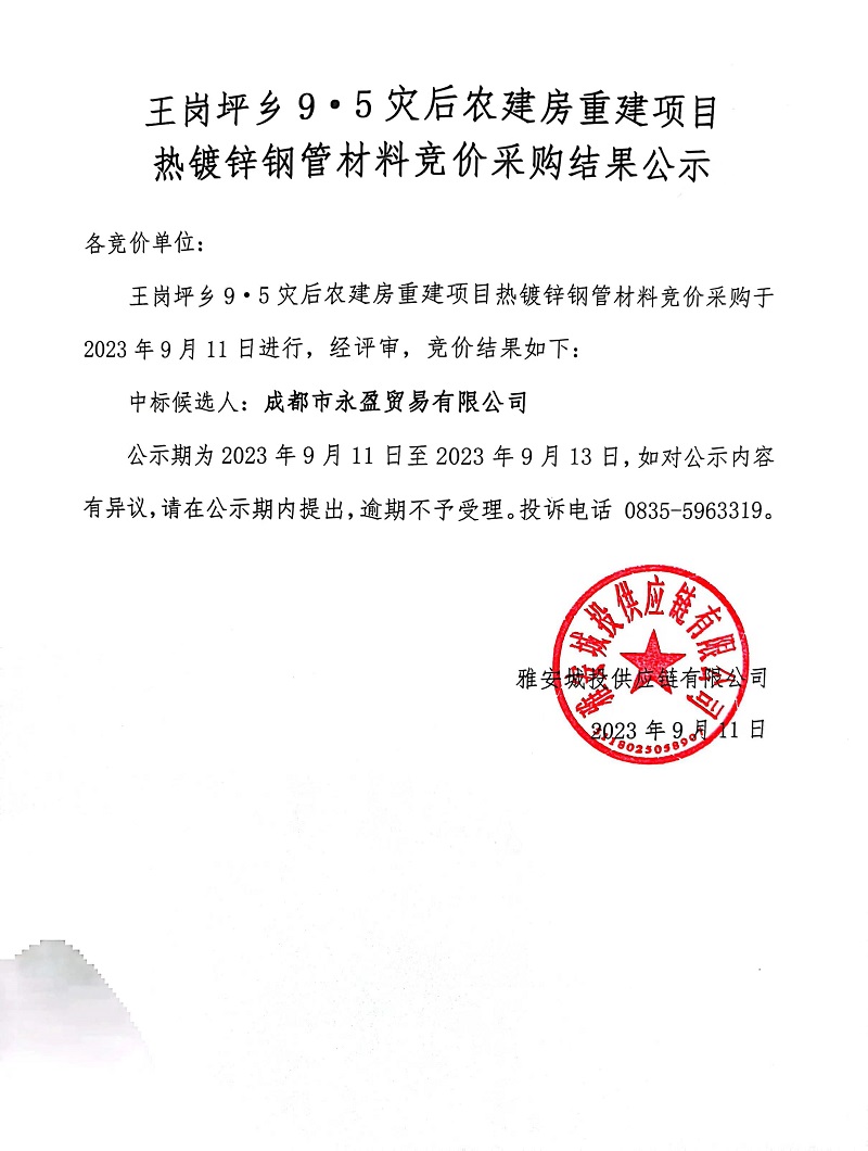 王崗坪鄉(xiāng)9.5災(zāi)后農(nóng)建房重建項(xiàng)目熱鍍鋅鋼管材料競(jìng)價(jià)采購(gòu)結(jié)果公示