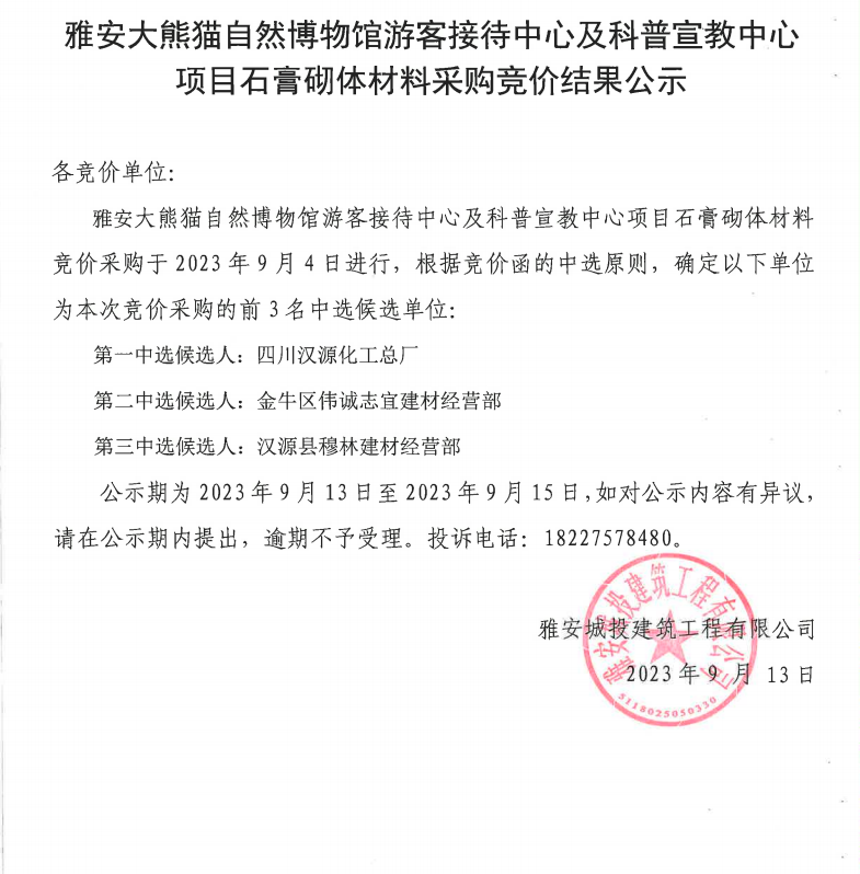 雅安大熊貓自然博物館游客接待中心及科普宣教中心項(xiàng)目石膏砌體材料采購(gòu)競(jìng)價(jià)結(jié)果公示