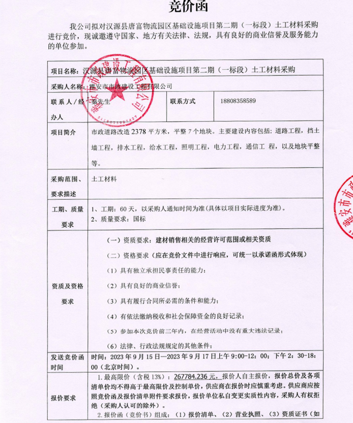 漢源縣唐富物流園區(qū)基礎(chǔ)設(shè)施項目第二期(一標段)土工材料采購競價公告
