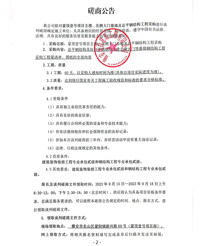 蒙頂壹號項目主樓、北側(cè)大門幕墻及總平鋼結(jié)構(gòu)工程采購談判磋商公告