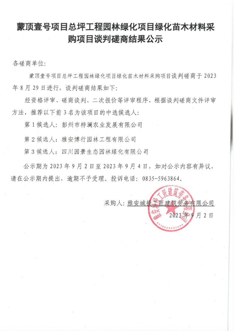 蒙頂壹號項目總坪工程園林綠化項目綠化苗木材料采購項目談判磋商結(jié)果公示