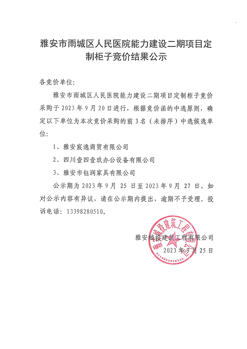 雅安市雨城區(qū)人民醫(yī)院能力建設(shè)二期項(xiàng)目定制柜子競(jìng)價(jià)結(jié)果公示
