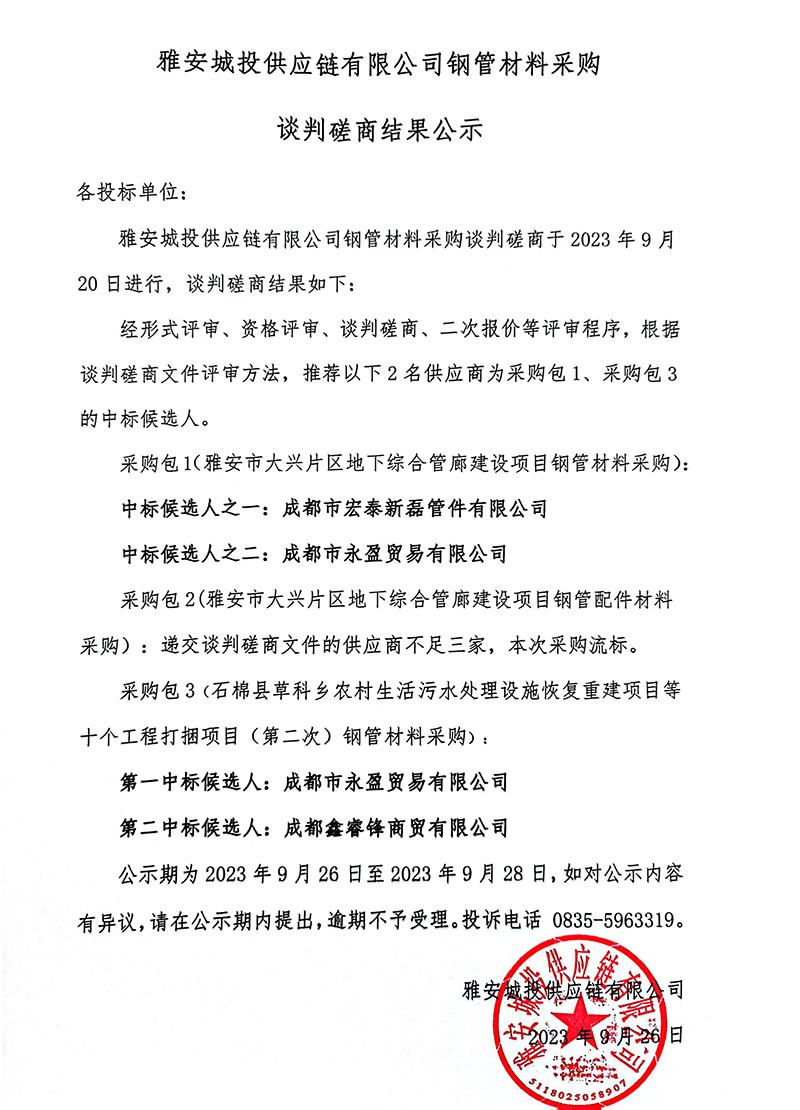雅安城投供應(yīng)鏈有限公司鋼管材料采購談判磋商結(jié)果公示