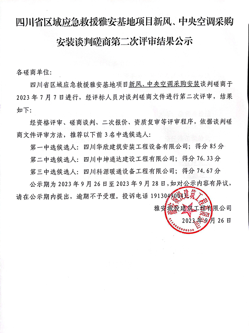 四川省區(qū)域應(yīng)急救援雅安基地項(xiàng)目新風(fēng)、中央空調(diào)采購安裝談判磋商第二次評(píng)審結(jié)果公示