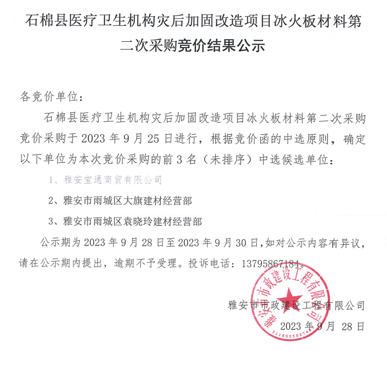 石棉縣醫(yī)療衛(wèi)生機構(gòu)災后加固改造項目冰火板材料第二次采購競價結(jié)果公示