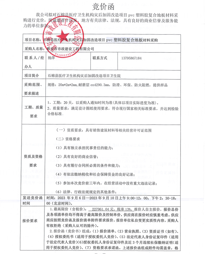石棉縣醫(yī)療衛(wèi)生機構(gòu)災后加固改造項目pvc塑料膠復合地板采購競價公告