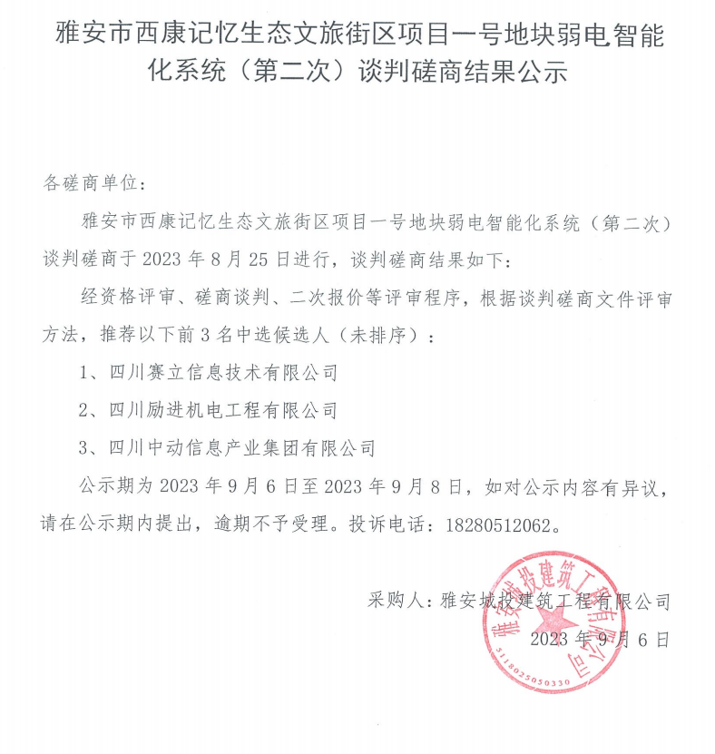 雅安市西康記憶生態(tài)文旅街區(qū)項目一號地塊弱電智能化系統(tǒng)(第二次) 談判磋商結(jié)果公示